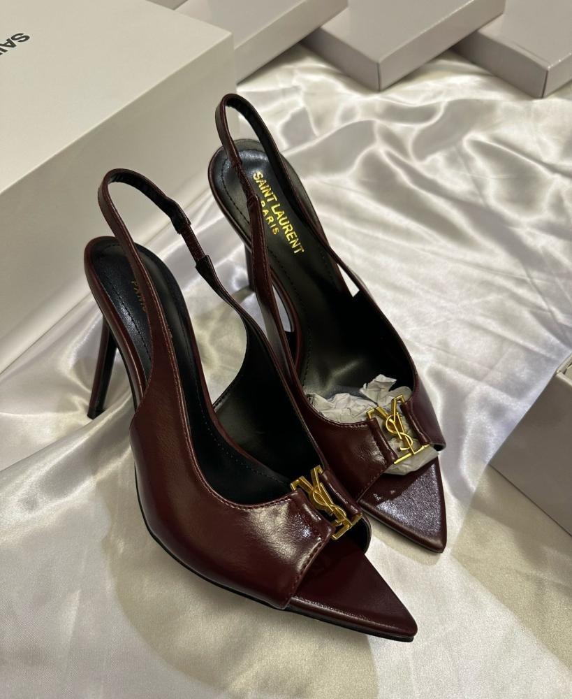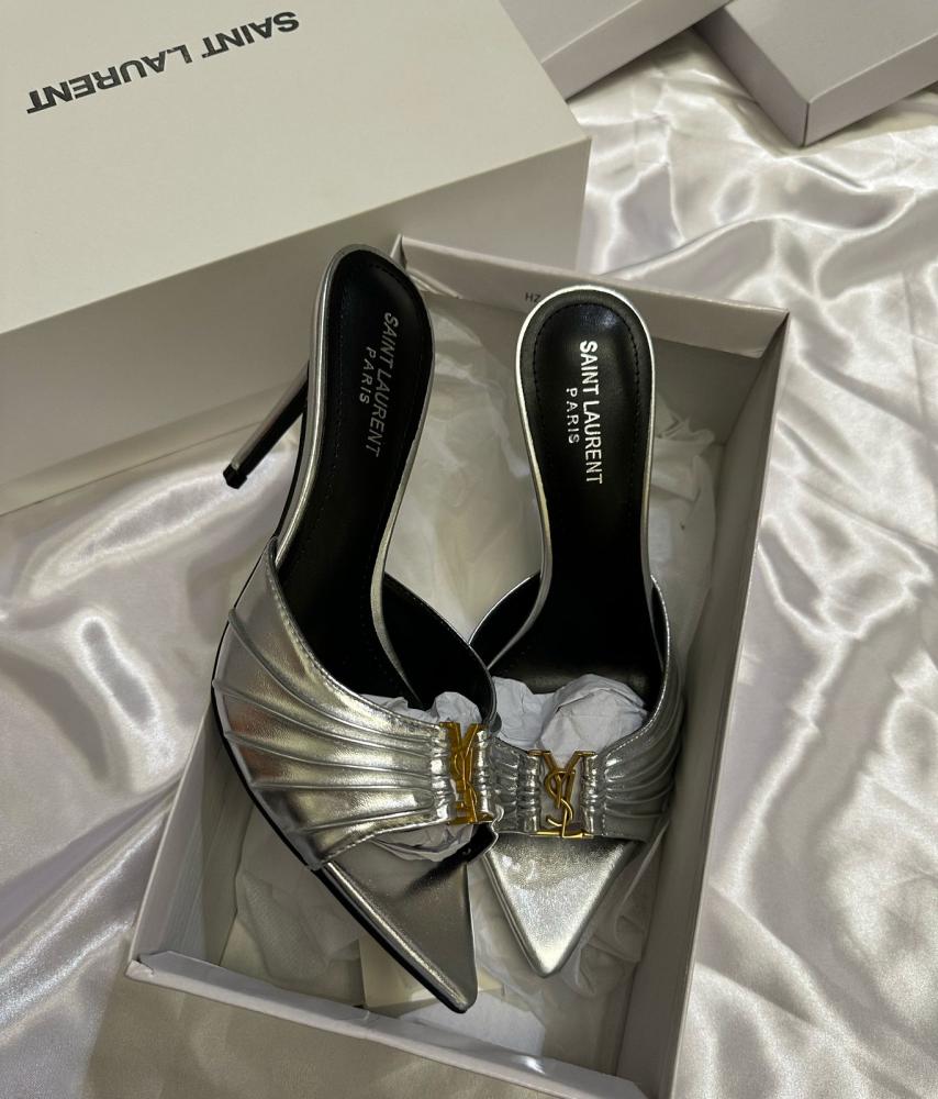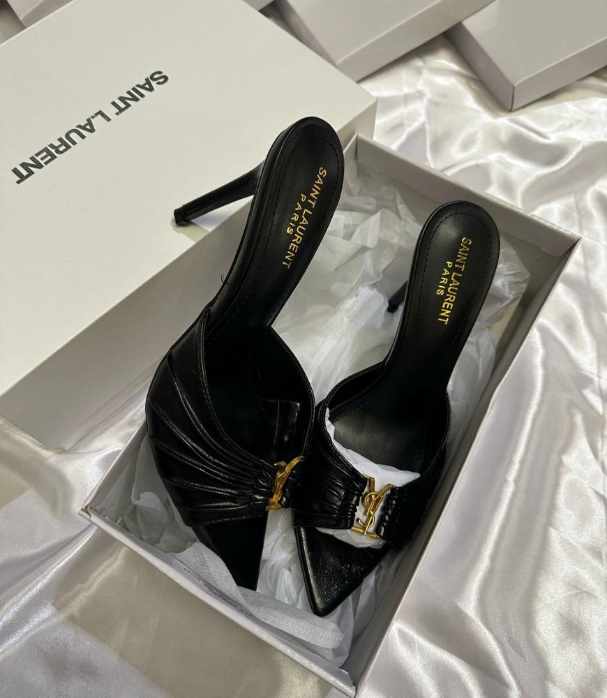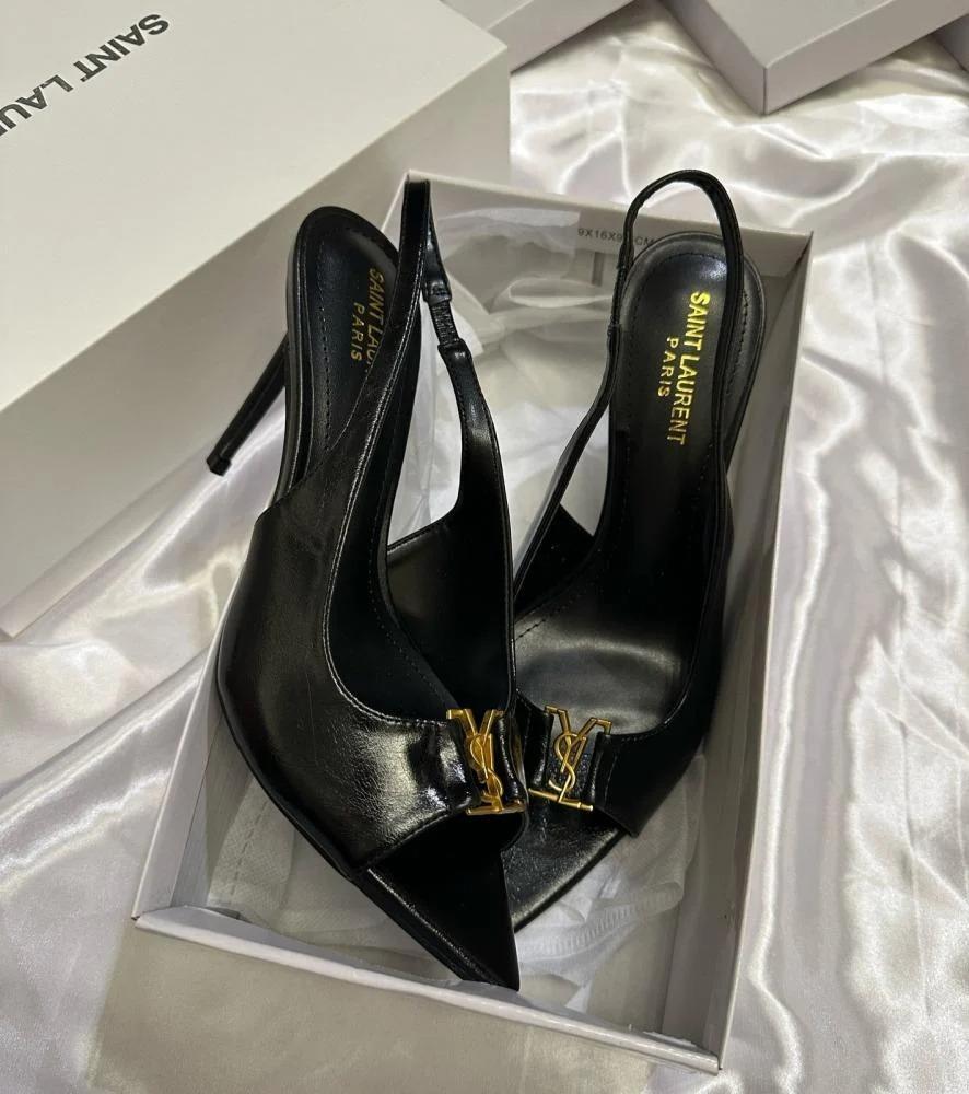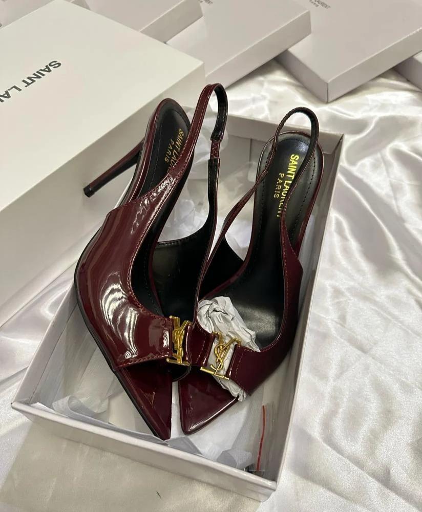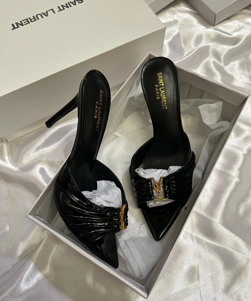 - التصميم: مقدمة مدببة مع تفاصيل مطوية أنيقة وشعار YSL الذهبي