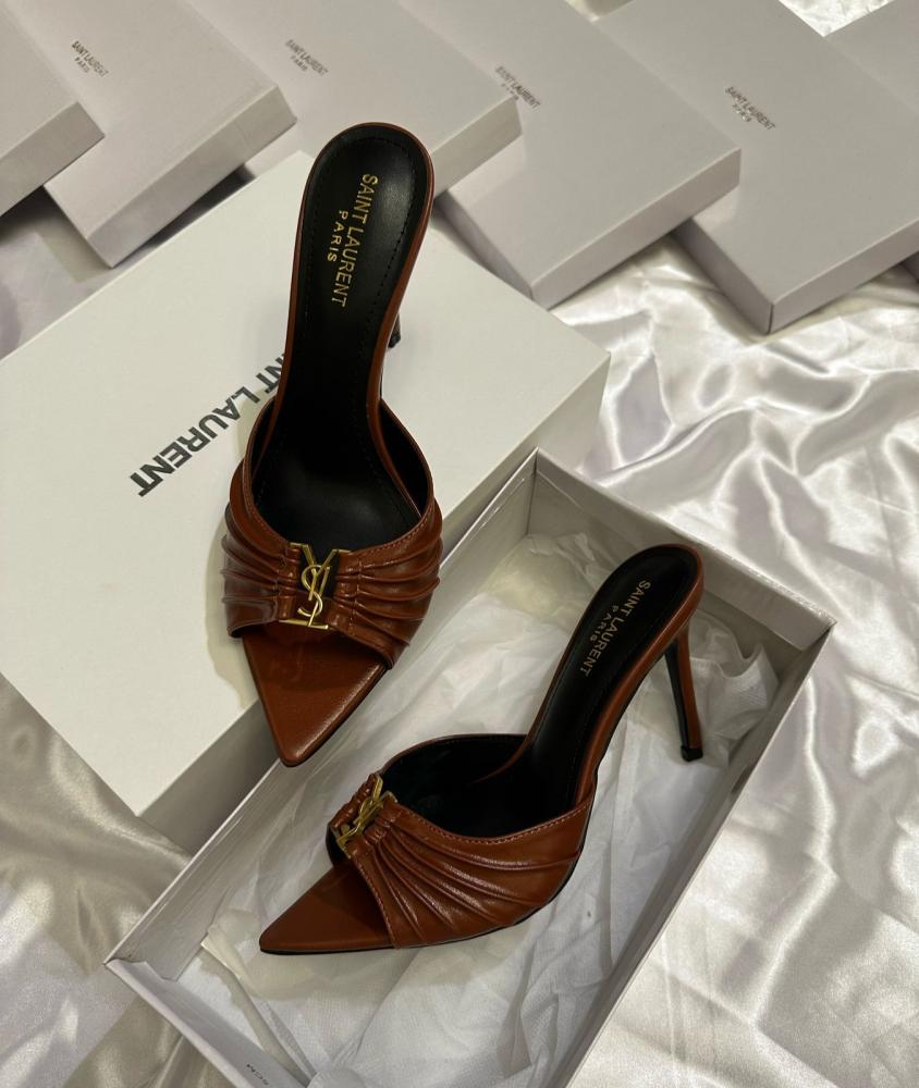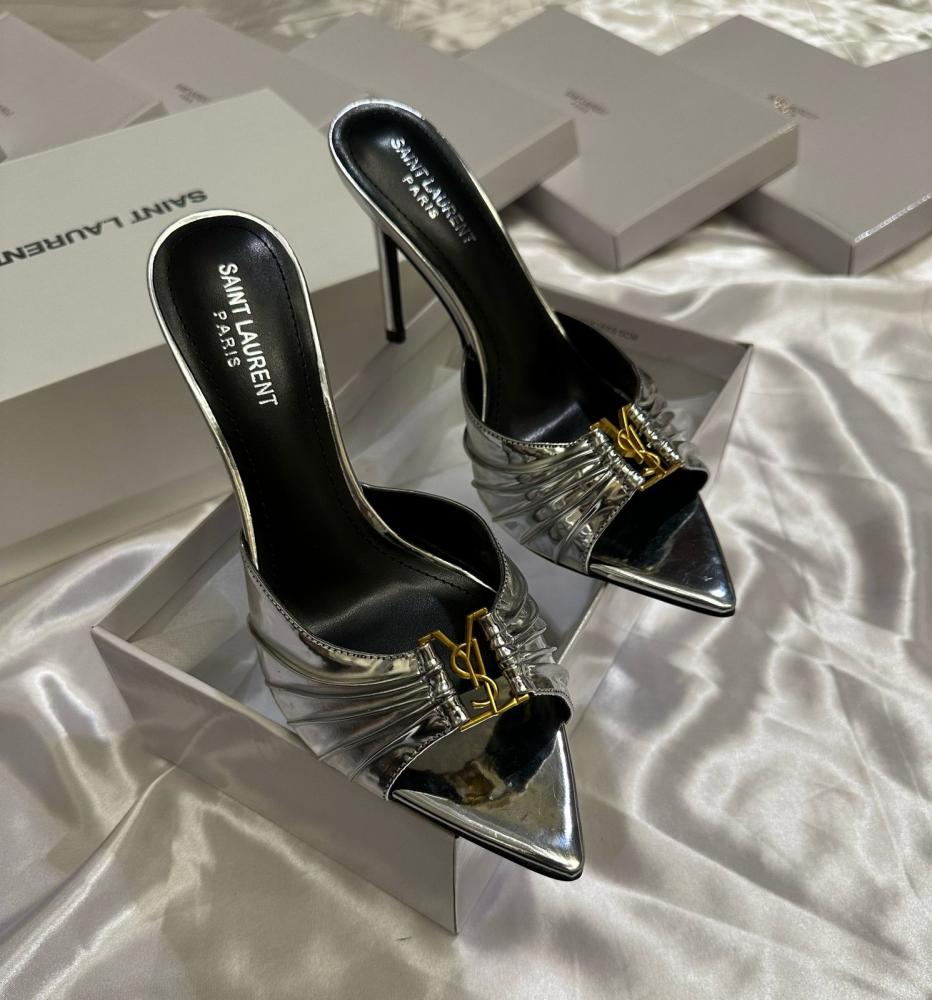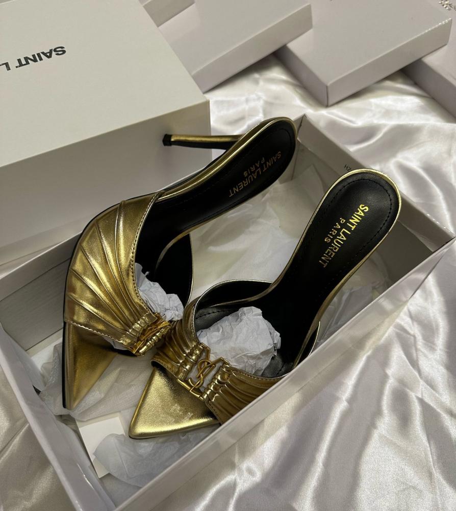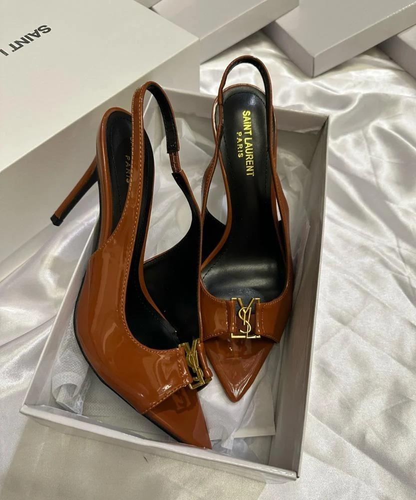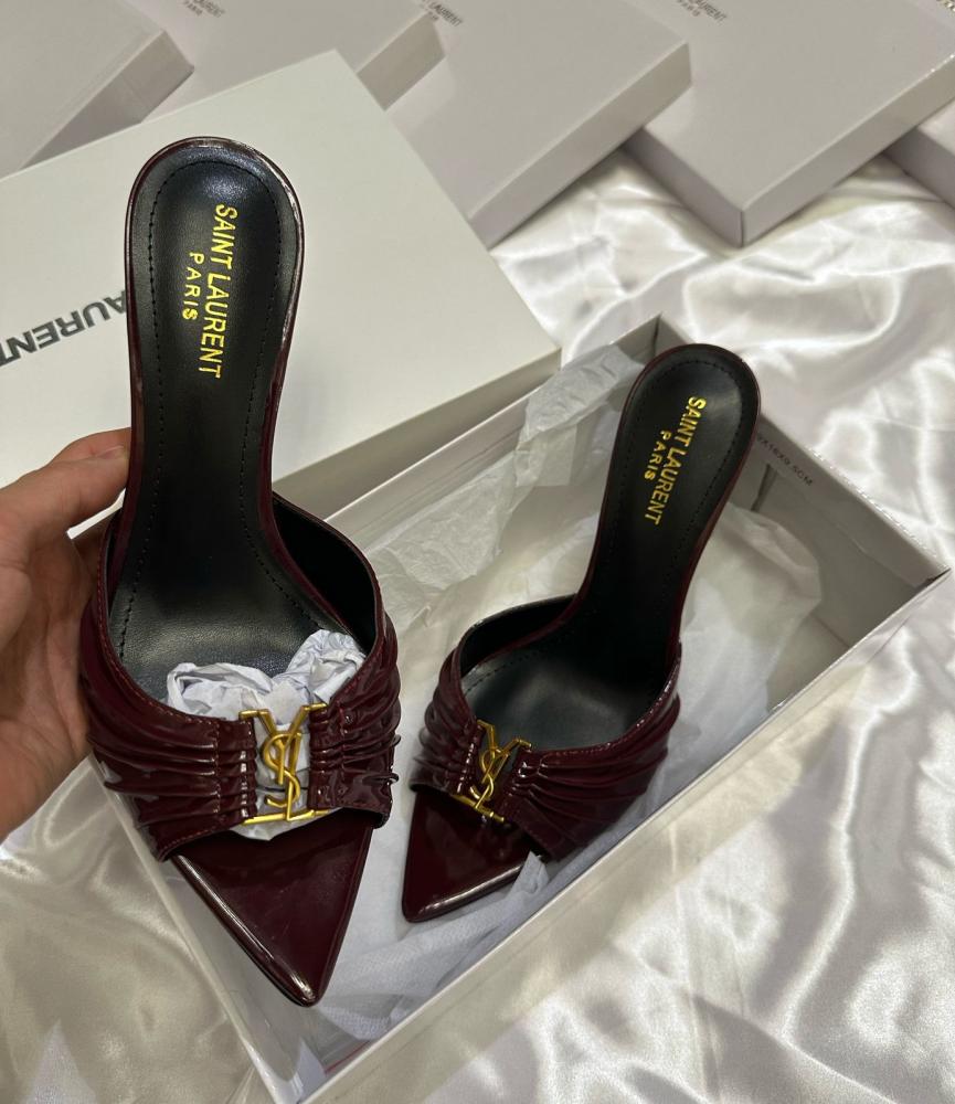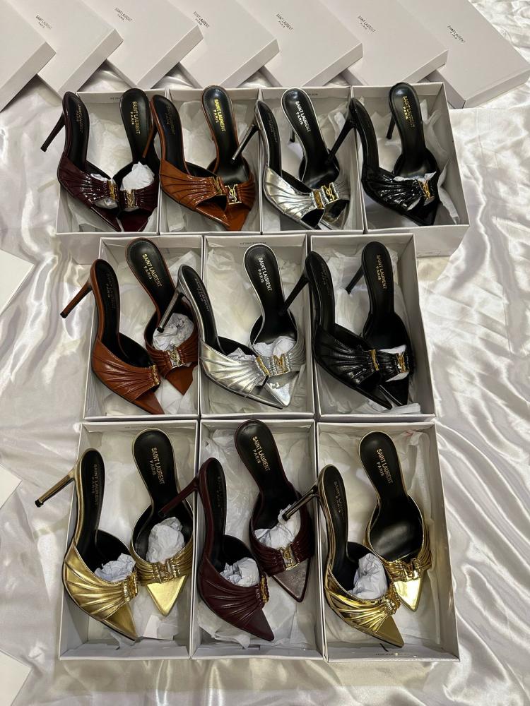 - التصميم: مقدمة مدببة مع تفاصيل مطوية أنيقة وشعار YSL الذهبي